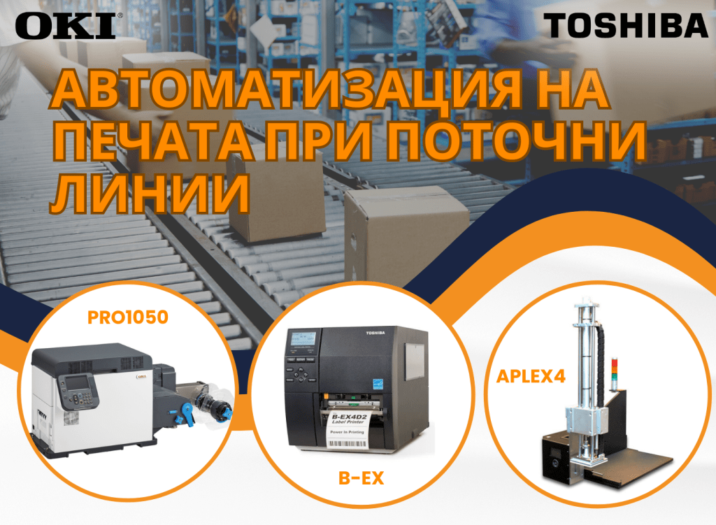Системата на Toshiba за автоматизиране на печата и етикирането на поточната линия включва апликатор за етикети и индустриален баркод принтер на Toshiba от серията B-EX4. В комбинация те създават ефективно и надеждно решение, което спестява разходи и е подходящо за редица приложения и сектори. Тази автматична система за печат и етикиране е лесна за използване и успешно се интегрира в съществуващата среда.
