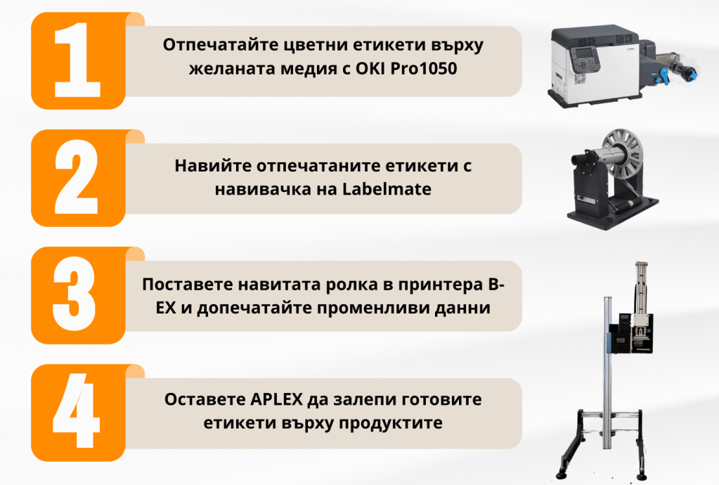 Достъпна дори и за по-малките компании, автоматичната система за етикиране работи безпроблемно със стандартните индустриални принтери Toshiba. Системата включва апликатор за етикети и индустриален баркод принтер на Toshiba от серията B-EX4.