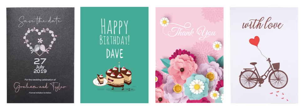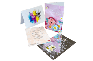 Бизнесът с поздравителни и сватбени картички може да предложи индивидуален подход, подходящ за всички поводи, благодарение на впечатляващите възможности за работа с медии на 5-цветните принтери на OKI. Възможността да се отпечатва на различни носители, включително релефни, изключително гладки, матови, гланцови, тъмни, светли, прозрачни, дебели или тънки, предлага безкрайни възможности. Дизайните на клиентите могат да се превърнат в реалност с гъвкавостта да се проектират онлайн и да се отпечатват в ярки цветове или в комбинация с бял и дори прозрачен цвят за акцент върху тъмни.