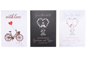 За сватбените поздравителни картички могат да се отпечатват индивидуални сватбени дизайни с едно натискане на бутон като комплимент за гостите. От „Запази датата“, покана и пликове преди големия ден, до сватбената програма, мястото на гостите, картички с места, опаковки за подаръци. Всичко, което е необходимо за сватба, перфектно съобразено и отпечатвано по заявка, включително отразени в последния момент промени в списъка с гости!